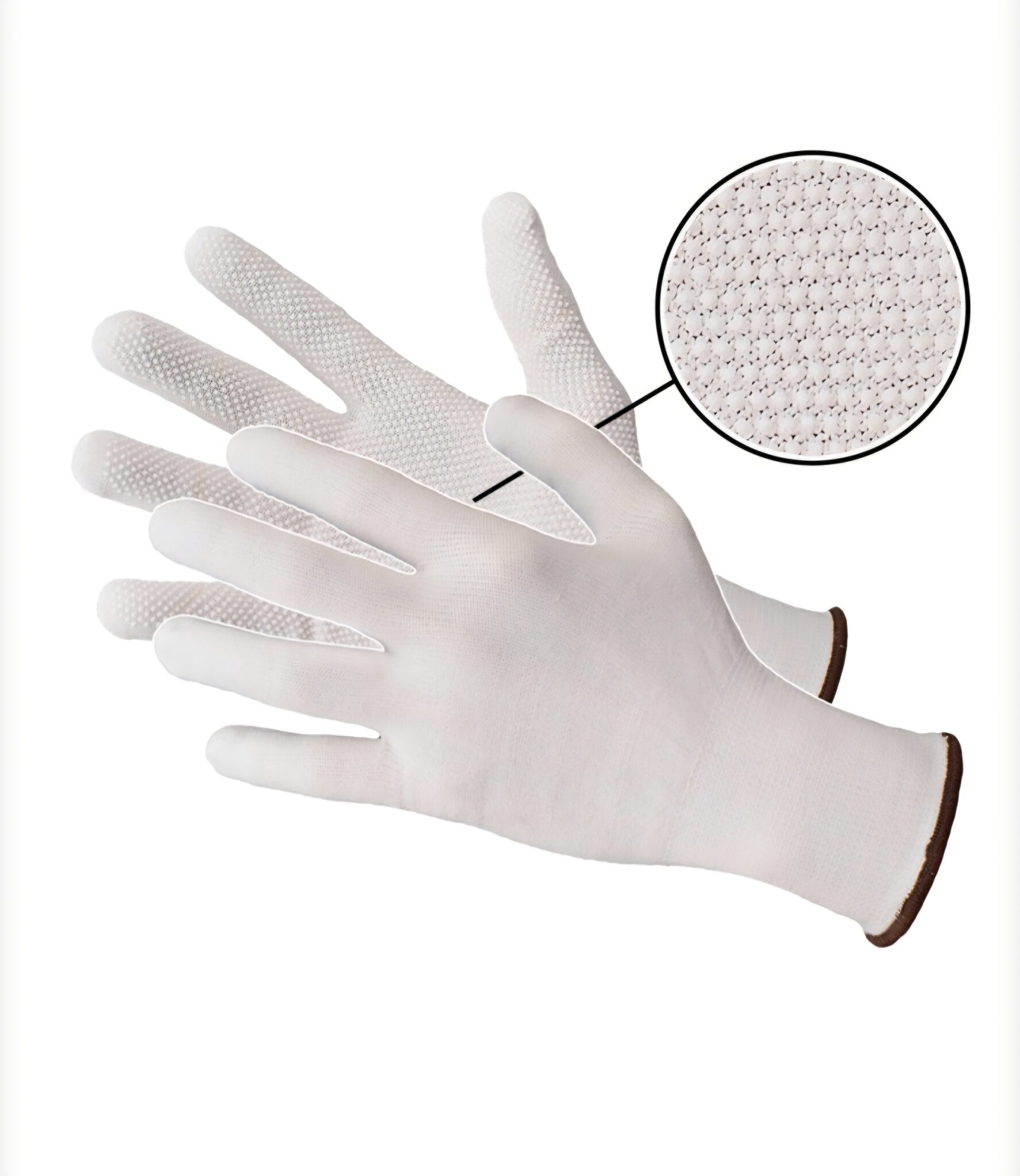 Ochranné rukavice vyrobené z elastickej pletenej bavlny (98 %) v bielej farbe s 2 % spandexu. Mikrobodkovaný PVC materiál na rukoväti, rebrované, bezšvové.